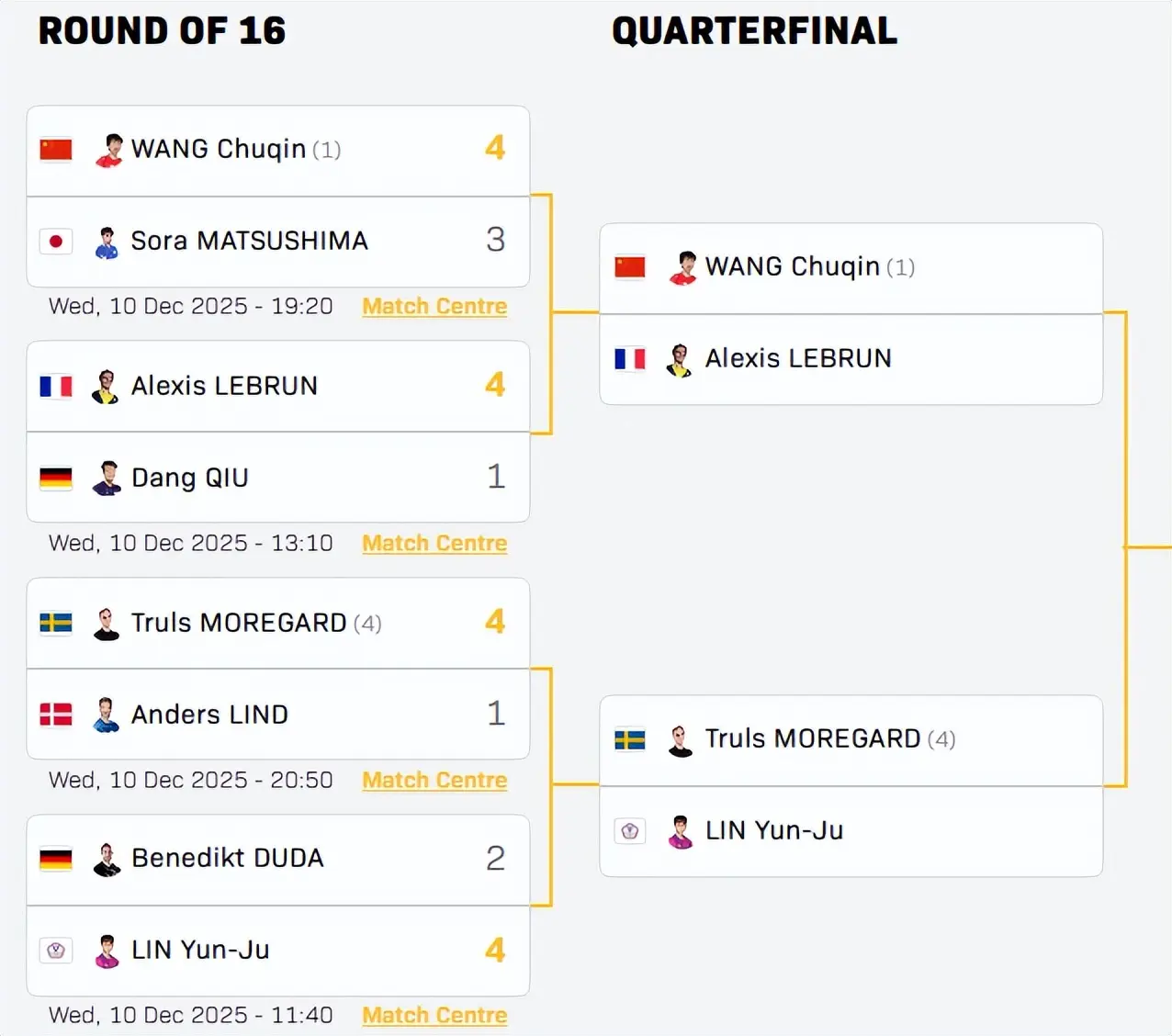 随着莫雷加德4-1林德京海配资,总决赛男单八强决出四席,上半区对阵全部确定,王楚钦VS大勒布伦。