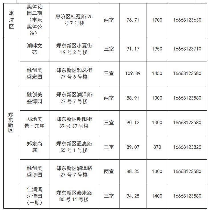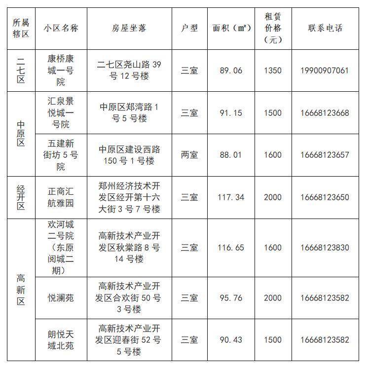 本批次配租房源共计15套(41间),其中为二七区1套(3间)、中原区2套(5间)、经开区1套(3间)、高新区3套(9间)、惠济区1套(2间)、郑东新区7套(19间)。水电费均为民用水电标准,房源精装修交付,周边配套设施齐全创界,配备家具家电,拎包入住,后续房源将根据装修进度情况陆续配租,具体以系统实际上线为准。运营单位为郑州城发安居有限公司。