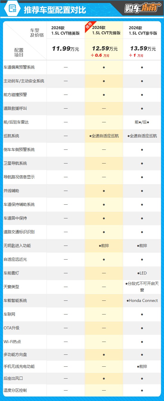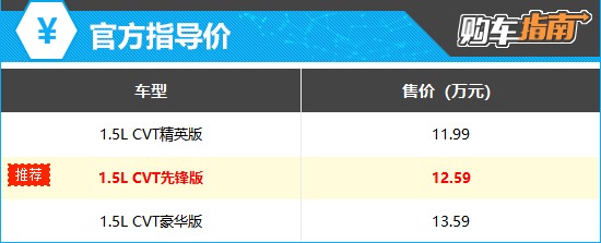 目前在售的3款车型中,更推荐1.5L CVT先锋版。相比入门版车型,推荐车型在主动安全配置、驾驶功能配置方面有明显提升,如增加主动刹车/主动安全系统、全速自适应巡航、车道保持辅助系统等,而价格却仅仅高出0.6万元,可谓是物超所值。