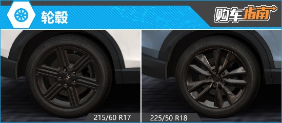 轮毂方面,新车提供两种尺寸可选,均采用黑色涂装。其中,17英寸轮毂采用六辐式设计,匹配规格为215/60 R17的轮胎;18英寸轮毂采用双五辐式设计,匹配规格为225/50 R18的轮胎。